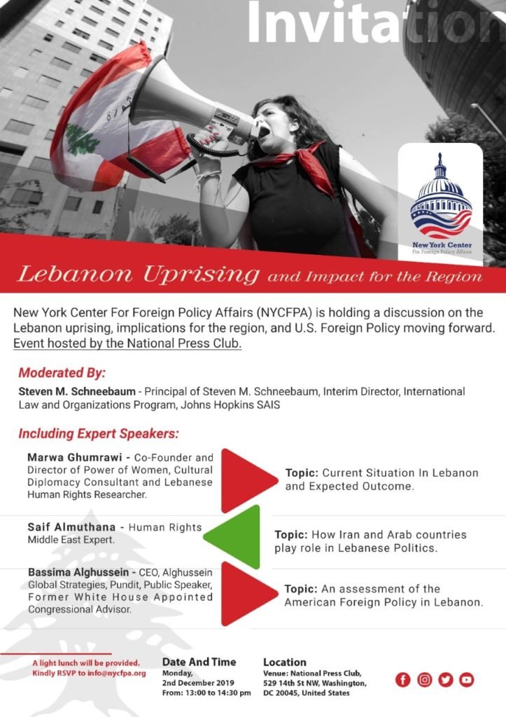 New York Center For Foreign Policy Affairs (NYCFPA) is holding a discussion on the Lebanon uprising, implications for the region, and U.S. Foreign Policy moving forward.
